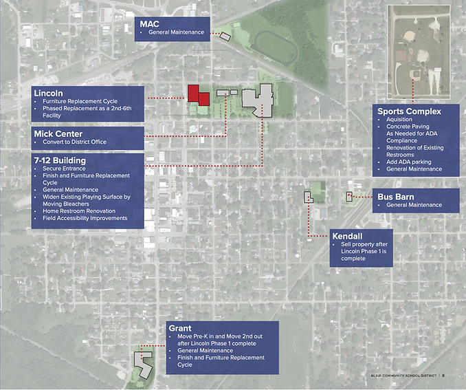 A variety of potential projects and plans that could support the Albia Community School District in the next decade have been identified and would affect every facility the district maintains today.